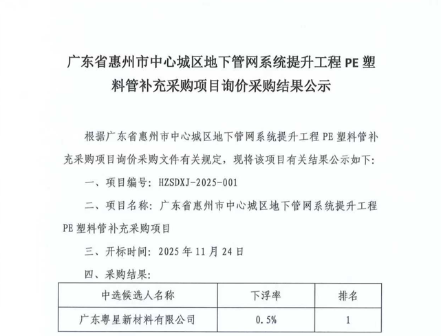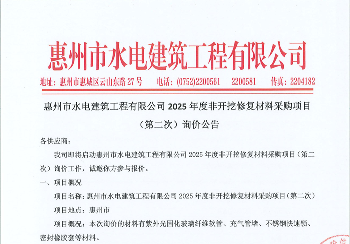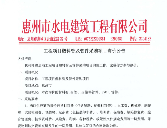 廣東省惠州市中心城區(qū)地下管網(wǎng)系統(tǒng)提升工程—雨水管網(wǎng)建設(shè)項(xiàng)目、惠州市增江龍門段治理工程施工(二標(biāo)段)塑料管及管件采購項(xiàng)目詢價公告……
